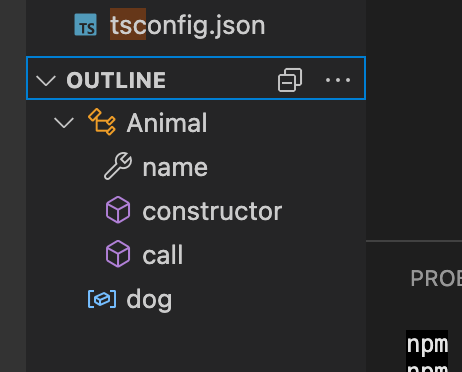 ** VS Code의 왼쪽 하단에 위치한 'OUTLINE'에는 선언된 프로퍼티의 타입을 확인할 수 있는 기능이 들어있다. 타입스크립트 공부시 유용하니 꼭 확인해보자.